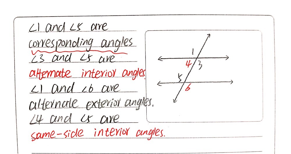 Its interior angles add up to 3 × 180° = 540°. There are 3 types of angles that are congruent: After substituting these angles by the measures given to us and simplifying, we have 11x + 37 = 180. So if i chose angle two the same side exterior would not be 6. Alternate interior angles are the angles that are formed on opposite sides of the transversal and inside statement for alternate interior angles: